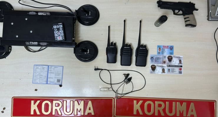 Araçta bulunan üç el telsizi, biber biber gazı, beş sahte kurum kimliği, bir airsoft (oyuncak) tabanca ve bir çakar tertibatına el kondu.