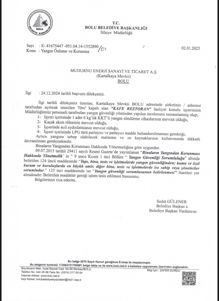 İtfaiye Müdürlüğü tarafından hazırlanan belge, Mudurnu Enerji Sanayi ve Ticaret A.Ş.’nin 24 Aralık 2024 tarihli başvurusuna cevaben hazırlanmış. Bu şirket otelin restoranını işleten şirket. Onay verilen tesis, yanan Grand Kartal Otel içerisinde.