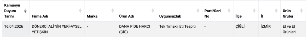 Bakanlığın 16 Nisan 2026 tarihindeki listesine göre ‘Dönerci Ali’nin yeri’ adlı işletmedeki dana pide harcında tek tırnaklı eti tespit edildi. İşletme Çiğli ilçesinde hizmet veriyor.