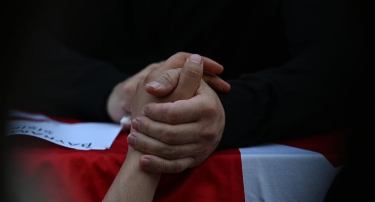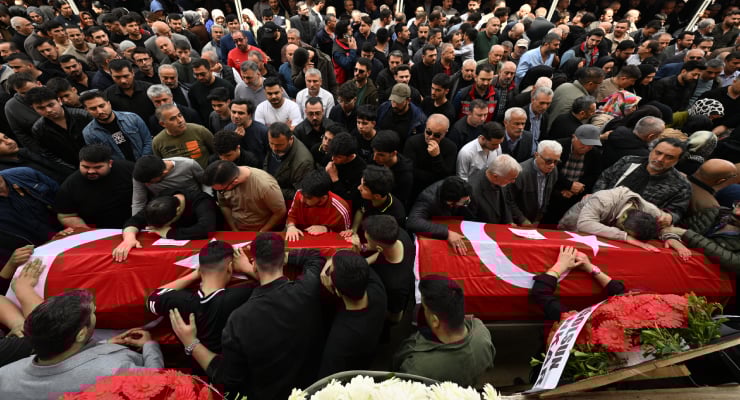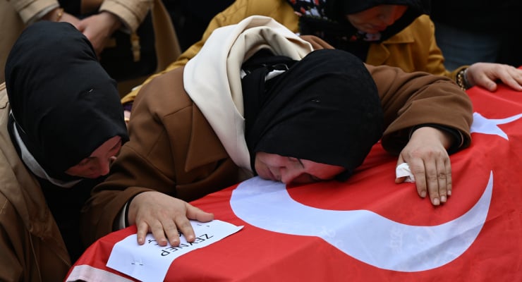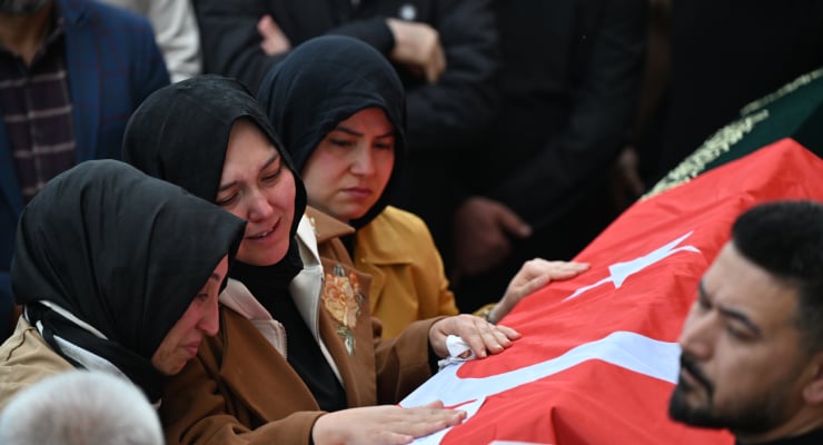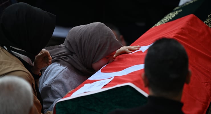 Crowd of mourners surrounding a coffin draped with a Turkish flag at a funeral ceremony.