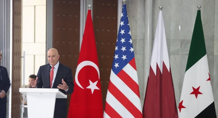 Törene Suriye Başkanlık Sarayı’nda törene ABD’nin Ankara Büyükelçisi ve Suriye Özel Temsilcisi Tom Barrack da katıldı. Barrack şöyle konuştu:
