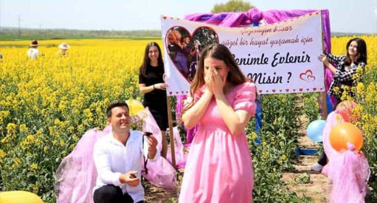 Doğum gününü kutlamak istediğini söyleyerek Öztürk’ü kanola tarlasına çağıran Karakaş, o gelmeden, bir etrafı balon ve tüllerle süslü masaya pastasını koydu. Yüzüğü hazırladı. Tarlanın ortasına, “Benimle evlenir misin” yazılı levhayı arkadaşları tuttu. Öztürk geldiğinde de diz çöküp teklifini yaptı.