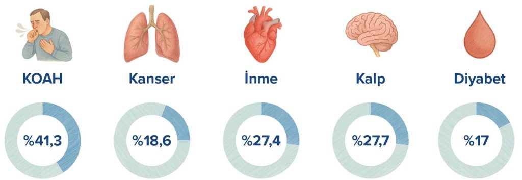 KOAH’a bağlı ölümlerin yüzde 41,3’ü, kalp hastalıklarına bağlı ölümlerin yüzde 27,7’si, inme kaynaklı ölümlerin yüzde 27,4’ü, akciğer kanserine bağlı ölümlerin yüzde 18,6’sı hava kirliliğinden kaynaklanıyor. Demans riski yaklaşık yüzde 8 yükseliyor.