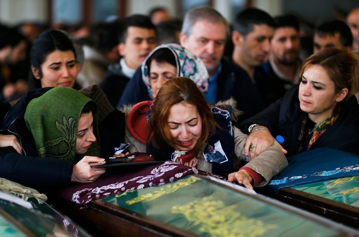 A woman cries over the coffin of a car bombing victim during a commemoration ceremony in a mosque in Ankara