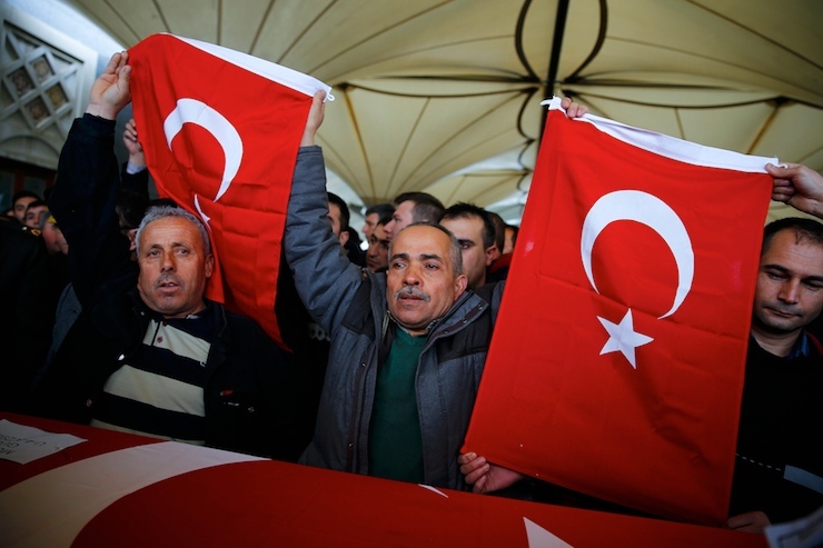 Men hold Turkish flags over the coffin of a car bombing victim during a commemoration ceremony in a mosque in Ankara