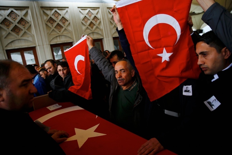 Men hold Turkish flags over the coffin of a car bombing victim during a commemoration ceremony in a mosque in Ankara