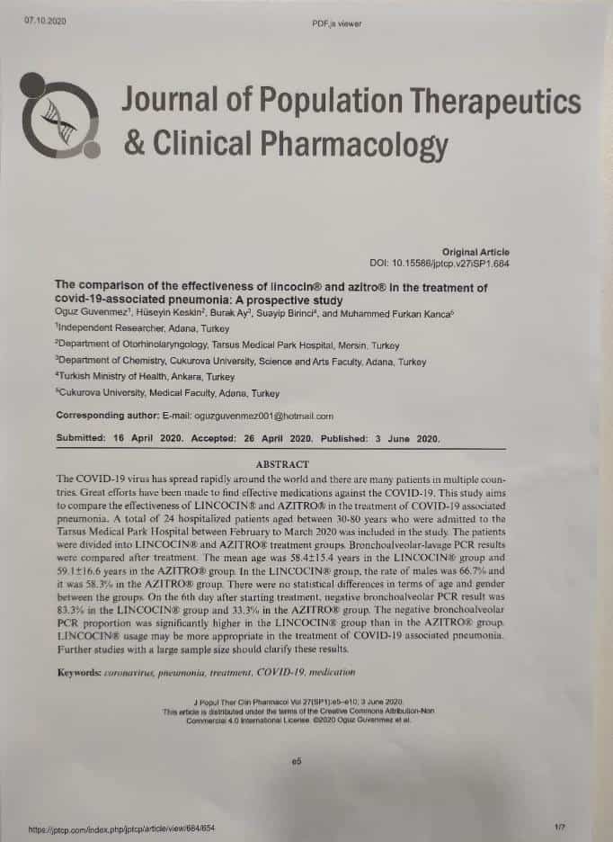 Adana Şehir Hastanesi Etik Kurulu’ndan onay alan çalışmanın bulguları 16 Nisan günü derginin hakem heyetine sunuldu, 26 Nisan’da yayına hazırlanmak üzere kabul edildi. Sonuçlar 3 Haziran’da Journal of Population Therapeutics and Clinical Pharmacology’de (Toplum Tedavi Bilimi ve Klinik Farmakoloji Dergisi) yayınlandı.