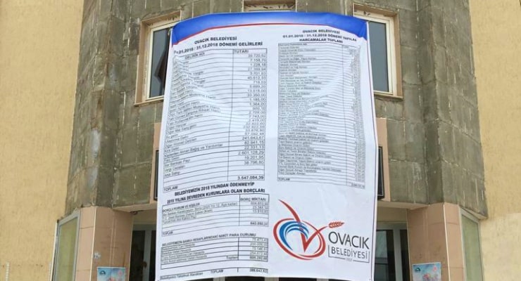 Pankartta yer alan verilere göre Ovacık belediyesinin 2018 yılında toplam 3 milyon 547 bin lira geliri gözükürken gideri ise 3 milyon 658 bin lira.