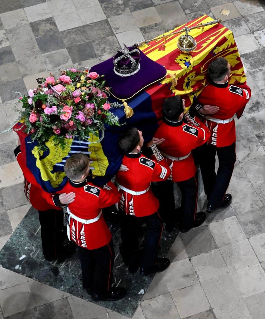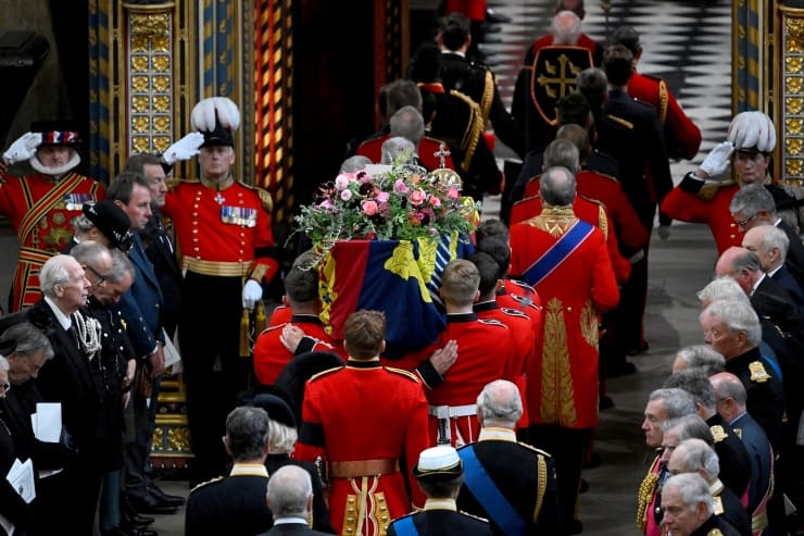 Kraliçe’nin tabutu Westminster Salonu’ndan çıkarak, resmi cenaze törenin yapılacağı Westminster Kilisesi’ne top arabası üzerinde taşınarak getirildi. Tabuta Kraliçe’nin çocukları Kral 3. Charles, Prenses Anne, Prens Andrew ve Prens Edward eşlik etti. Onların ardından da Prens William ve Harry de dahil olmak üzere torunları yürüdü.