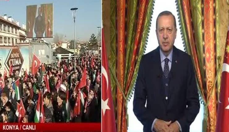 Konya’da düzenlenen Kudüs mitingine video konferansla bağlanan Erdoğan, bu hafta İstanbul’da yapılan İslam İşbirliği Teşkilatı liderler zirvesinde Doğu Kudüs’ün Filistin’in başkenti olarak tanındığını hatırlattı.