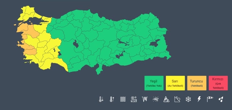 Sarı: Hava durumu potansiyel tehlikelidir. Tahmin edilen meteorolojik hadise olağandışı olmamakla birlikte, meteorolojik şartlardan etkilenebilecek faaliyetler konusunda dikkatli olunmalı.