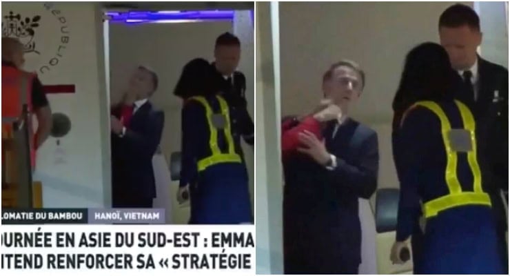 Macron, Güney Doğu Asya turunun ilk ayağı Vietnam’a gitmiş, uçağın kapısı açılırken kırmızı elbiseli bir elin Fransız cumhurbaşkanına tokat attığı görülmüştü.
