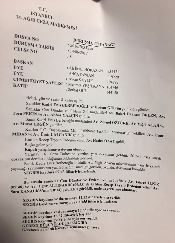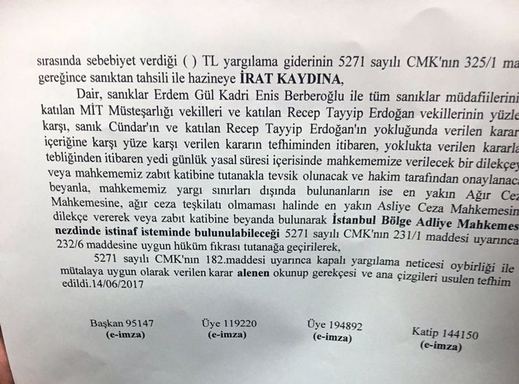 * Berberoğlu hakkındaki ‘silahlı terör örgütüne üye olmaksızın bilerek ve isteyerek yardım etme’ suçlaması ayrılarak başka bir davada görülecek. Berberoğlu o davada Can Dündar ve Erdem Gül’le birlikte yargılanacak.