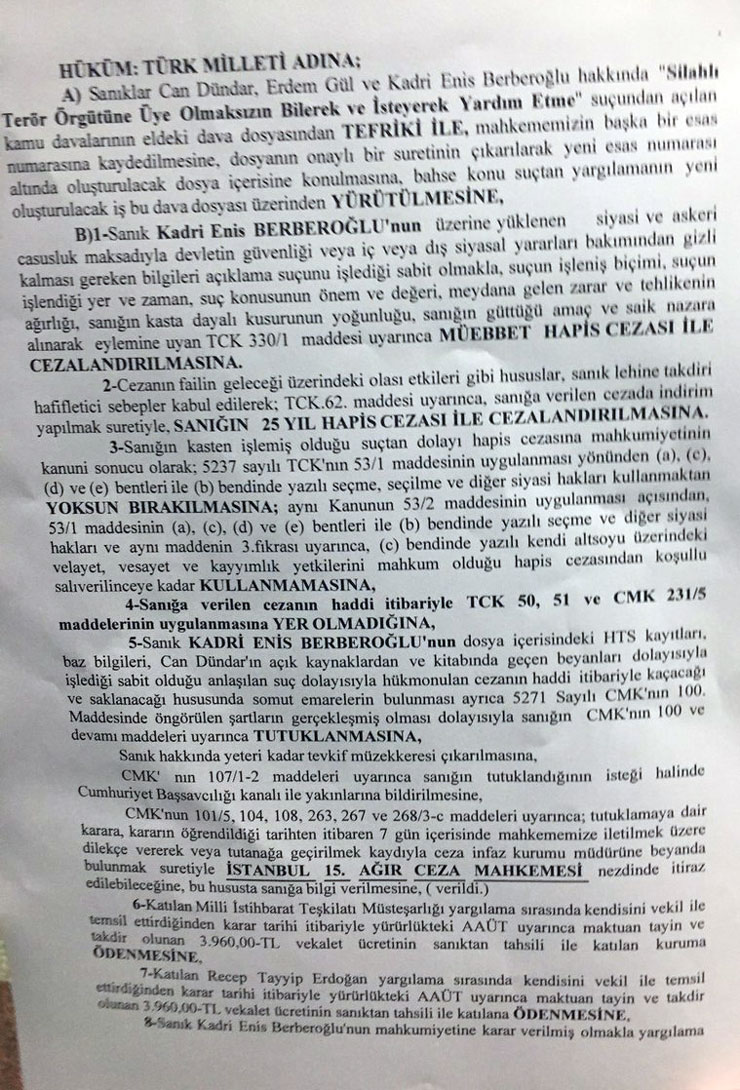 * Berberoğlu’na ‘siyasi ve askeri casusluk maksadıyla‘ devletin gizli belgelerini verdiğinin sabit olması gerekçesiyle önce müebbet hapis cezası verildi, ardından takdir indirimiyle 25 yıla çevrildi.