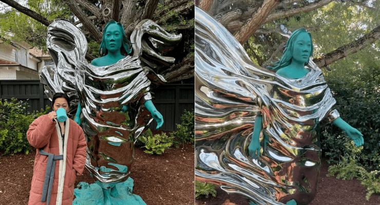Turkuaz rengi bir kadının üzerine örtülmüş gümüş bir örtüden oluşan heykeli, New Yorklu sanatçı Daniel Arsham yaptı. Heykel çiftin evinin bahçesindeki bir ağacın altına yerleştirildi.