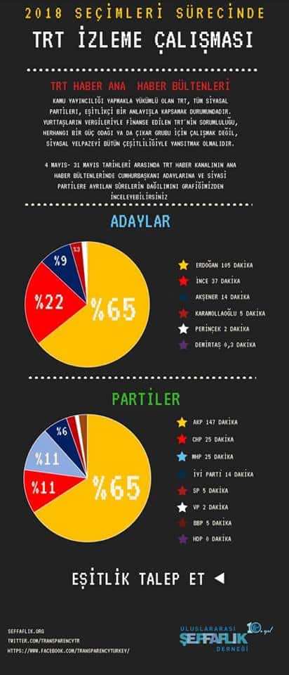 Uluslararası Şeffaflık Derneği’nin araştırmasına göre TRT Haber mayıs ayında HDP’nin cumhurbaşkanı adayı Selahattin Demirtaş’a sadece 3 saniye yer verdi. Aynı dönemde Cumhurbaşkanı Tayyip Erdoğan’ın aldığı süre ise 105 dakika.