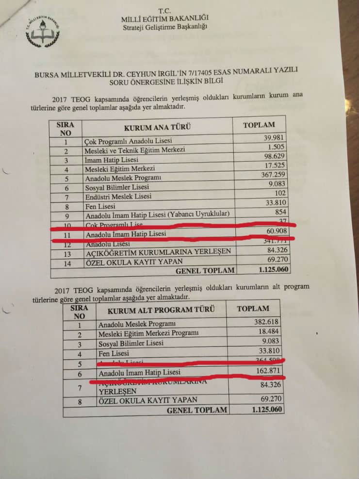CHP Bursa Milletvekili Ceyhun İrgil, dün gazetecilerle Milli Eğitim Bakanlığı’nın 2017 TEOG kapsamında okul türlerine göre yerleştirilen öğrenci sayısına dair yazılı soru önergesine verdiği yanıtı paylaşmıştı.