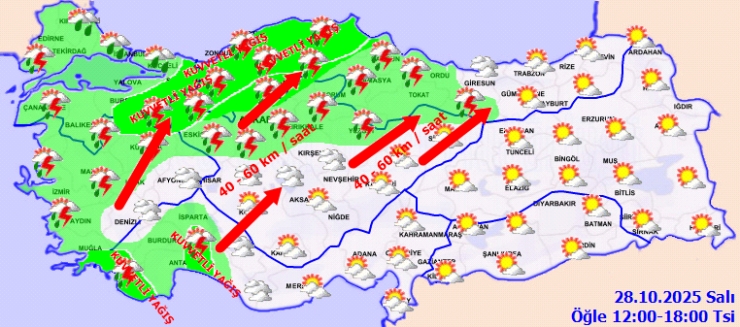 Rüzgar genelde güneyli yönlerden hafif, ara sıra orta kuvvette esecek. Marmara’nın güney kesimleri, İç Ege, Batı ve Orta Karadeniz’in iç kesimleriyle İç Anadolu’da güney ve güneybatı yönlerden, Orta Karadeniz kıyılarında kuzeyli yönlerden kuvvetli (40-60 km/sa) olması bekleniyor.