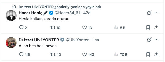 Öte yandan Yönter, dün X’ten “Allah bes baki heves” diye bir paylaşım yaptı.