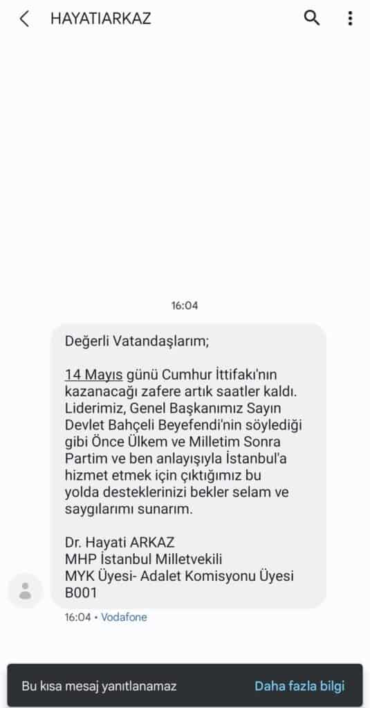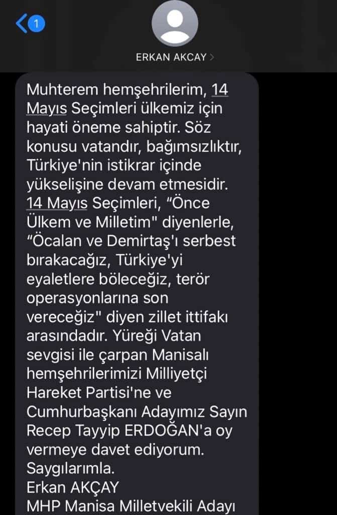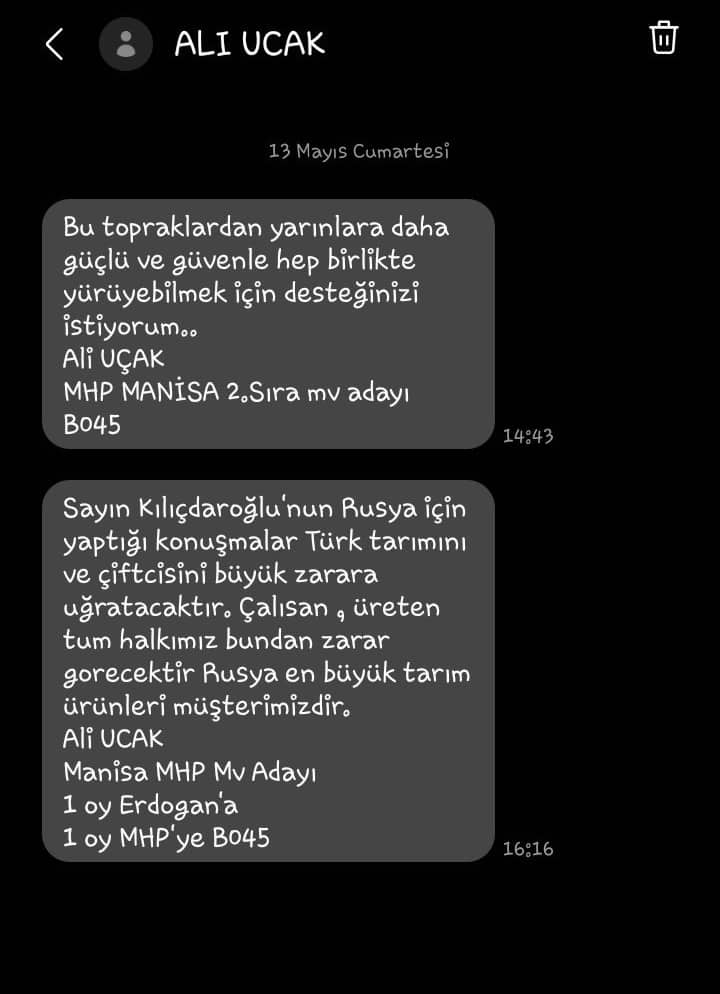 14 Mayıs seçimlerine saatler kala MHP’nin Manisa milletvekili adayları yurttaşlara kısa mesaj yağdırdı. Yasak olmasına rağmen atılan mesajlarda millet ittifakı hakkında sahte bilgilere yer verildi.