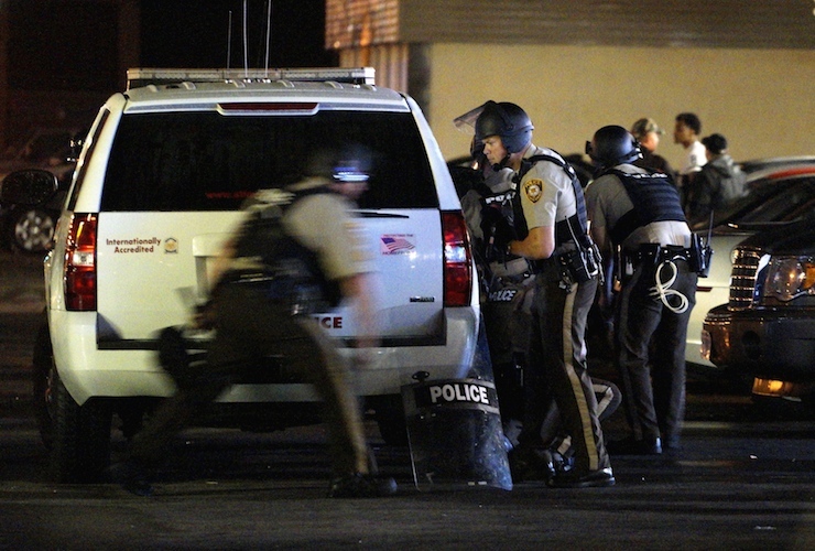 A police officer runs to take cover after shots were fired in a police-officer involved shooting in Ferguson