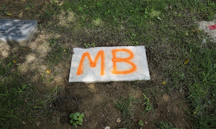 Piece of concrete with “MB” spray painted on it marks the grave of Michael Brown at St. Peter's Cemetery in Normandy