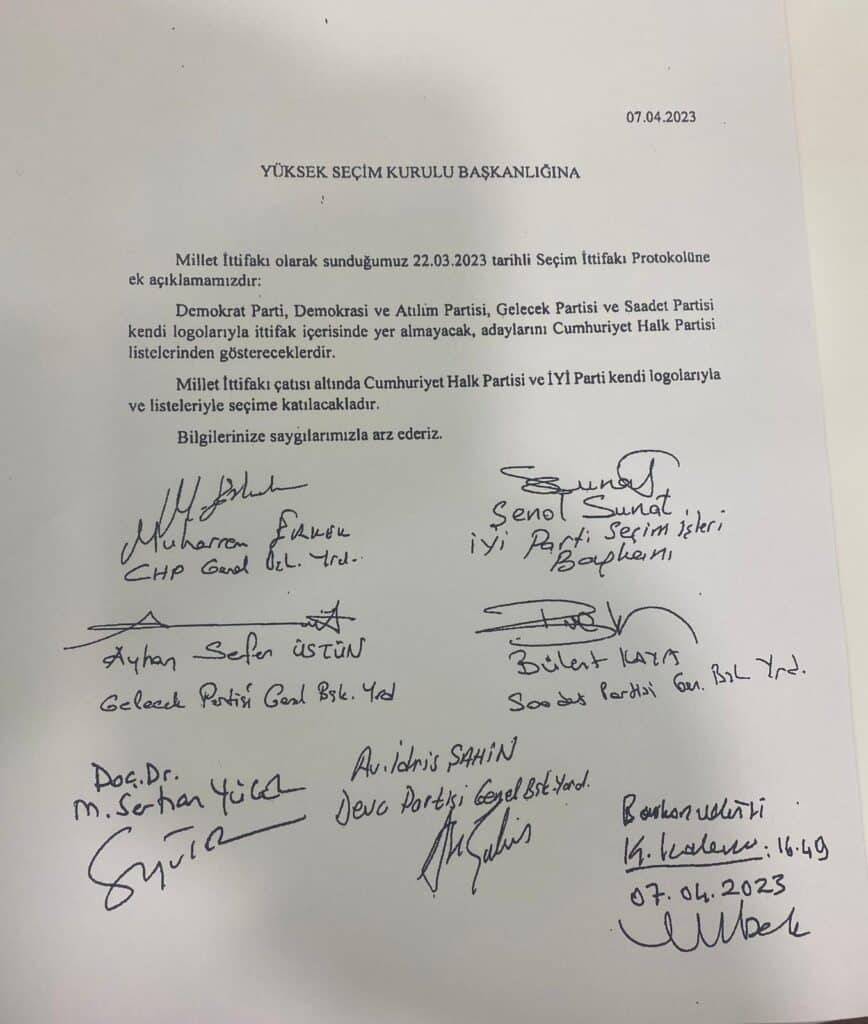 Tek listede anlaşan millet ittifakı, Yüksek Seçim Kurulu’na (YSK) ek protokol sundu. Dört parti CHP listelerinden, CHP ve İYİ Parti kendi listelerinden seçime girecek.