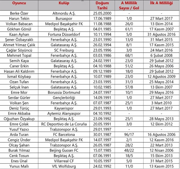 A milli takım aday kadrosu şu isimlerden oluştu;