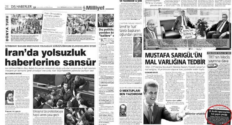 Milliyet İran gazetesi mi? 18/01/2014 04:21 Okuma süresi: 1 dk. WhatsAppXFacebookTelegramLinkedinCopy URLPinterestReddItFlipEmailYazdır İran’da yolsuzluk haberlerine sansür haberi sayfanın manşetinde, Türkiye’deki yolsuzluk haberlerine yayın yasağı sayfanın dibinde… Milliyet İran’da mı yayınlanıyor? WhatsAppXFacebookTelegramLinkedinCopy URLPinterestReddItFlipEmailYazdır Ana SayfaMedya Osman Kavala 3 bin 91 gündür hapiste