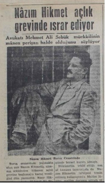 Türk Harp Okulu Komutanlığı Mahkemesi ve Donanma Komutanlığı Mahkemesi’nin 1938’de verdiği ağır cezalar 28 yıl dört aya bağlanmıştı ve 12 yıldır hapisteydi Nâzım. Bursa Cezaevi’nde, 8 Nisan 1950’de ilk açlık grevine başladığında kendisi için endişelenenlere “Canımı dilekçeme pul olarak yapıştırdım” diyecekti.