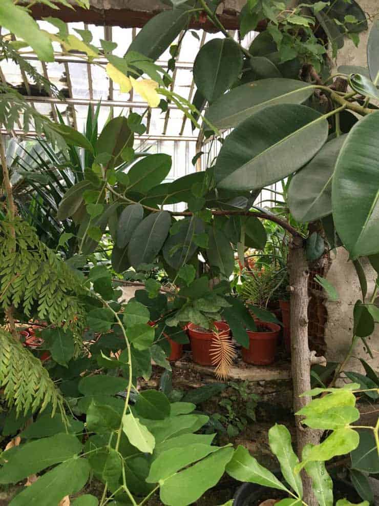 Bitkilerin arasından yürünebilen bir serada üzerinde nilüferlerin yattığı bir havuz karşılıyor bizi. İçerinin nem ihtiyacını karşılayan havuzun üzerinden epifit bitkiler (keçi sakalı) sarkıyor. Başka bir havuzun içinden yeşil kalın gövdesiyle bir muz ağacı yükseliyor. Kırmızı muz bile yetişiyormuş burada.