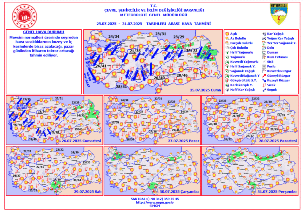 MGM’nin orta ve uzun vadeli tahminlerine göre kentte sıcak hava 27 Temmuz’a (Pazar)kadar etkisini sürdürecek. 28-29 Temmuz’daysa yüksek nem bekleniyor.