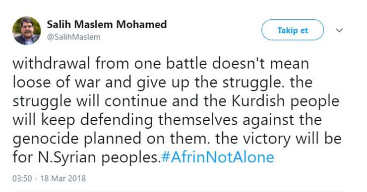 Afrin’i TSK ve ÖSO’nun ele geçirmesi sonrası YPG şu saatlere kadar sessiz kalırken, konuyla ilgili ilk açıklama PYD’nin eski eş başkanı Salih Müslim’den geldi.