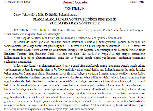 *Bu durumda özellikle dar parsellerde komşu parsele (yan bahçeye) çıkma yapılarak yeni yapı kurmak mümkün olmayacaktır. İşin ilginç tarafı mevcut kapalı çıkmalı konutların bu yönetmelik kapsamında emsal haklarını koruyarak yenilenemeyeceğidir.