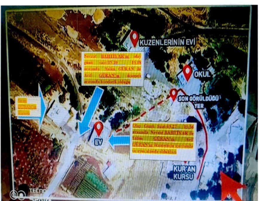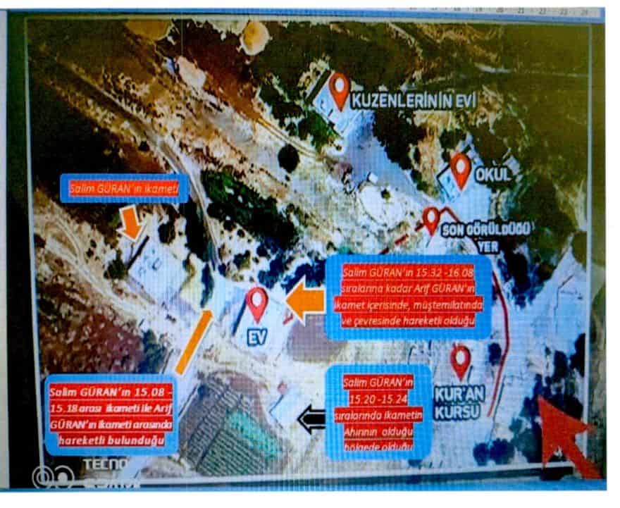 * Salim Güran’ın aynı gün 14.52 sıralarında ikametinden çıktığı, 15.19’a kadar Arif Güran’ın ikameti ve yakınlarında bulunduğu, 15.20’de Arif Güran’ın ikametine geldiği ve giriş yaptığı daha sonra evin arka tarafında bulunan ahır kısmına geçip geri Arif Güran’ın ikametine girdiği ve 16.10’a kadar Arif Güran’ın evinde ve müştemilatında olduğu değerlendirilmektedir.