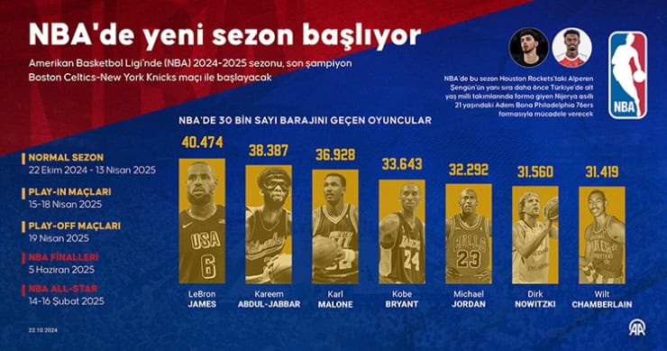 Amerikan Basketbol Ligi’nde (NBA) 2024-2025 sezonu, 22 Ekim’i 23 Ekim’e bağlayan gece iki maçla başlayacak.