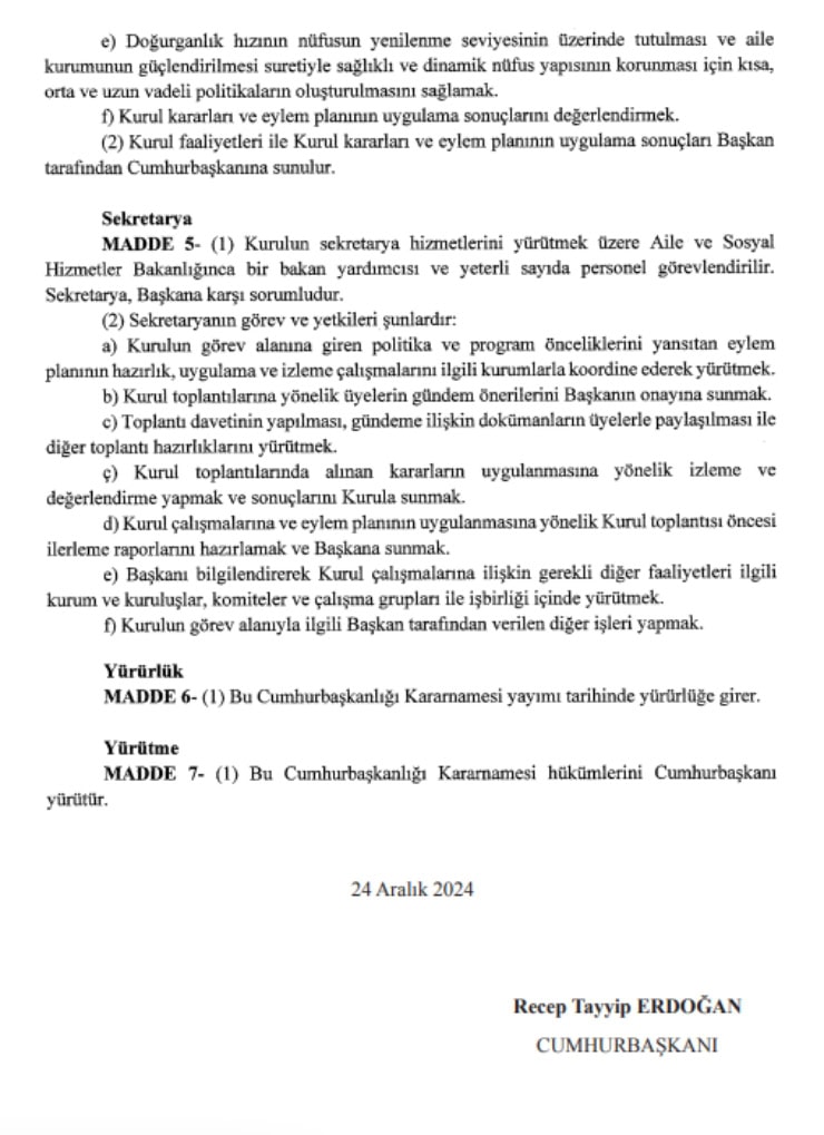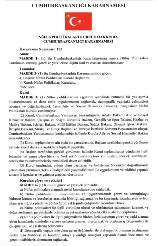 Cumhurbaşkanı Tayyip Erdoğan’ın imzasıyla yayımlanan kararnameye göre demografik yapıdaki gelişmeleri izlemek ve değerlendirmek üzere bakanlık bünyesinde Nüfus Politikaları Kurulu kuruldu.
