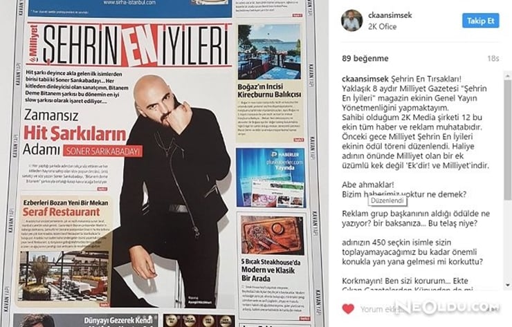 Instagram hesabından açıklama yapan şirketin sahibi Kaan Şimşek, gazeteye ‘Şehrin en tırsakları’ diye seslenerek “Yaklaşık sekiz aydır Milliyet gazetesi ‘Şehrin En İyileri’ magazin ekinin genel yayın yönetmenliğini yapmaktayım” dedi.