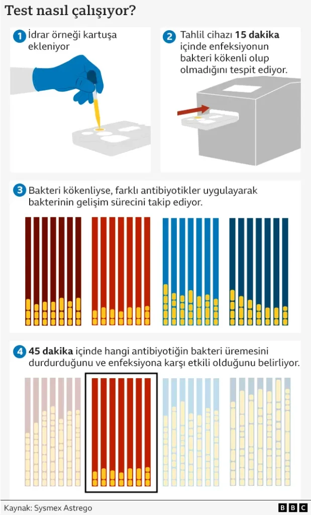 BBC Türkçe’nin aktardığına göre test, idrar yolu enfeksiyonlarında, enfeksiyonun bakteri kaynaklı mı olduğunu tespit ediyor ve bakteriye karşı uygulanması gereken doğru antibiyotik tedavisini belirliyor. Böylelikle yanlış ya da gereksiz antibiyotik kullanımı önleniyor.