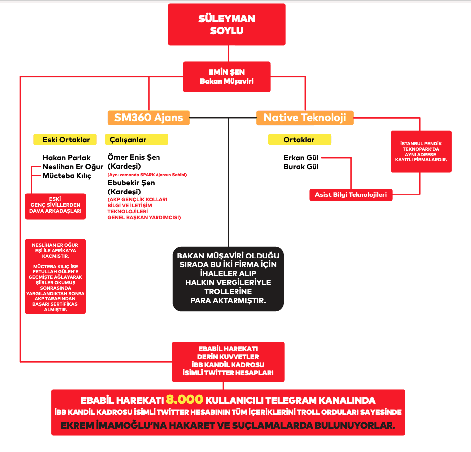 CHP Manisa Milletvekili Özgür Özel, İçişleri Bakanı Süleyman Soylu’ya bağlı olduğunu ve başında bakanlık danışmanı Emin Şen’in bulunduğunu iddia etti trol organizasyonunun şemasını paylaştı.