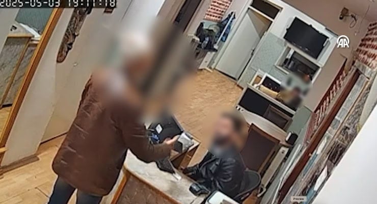 Öte yandan Anadolu Ajansı (AA) görüntüleri saldırganın yüzünü blurlayarak, otel çalışanınıysa açık şekilde vererek servis etti.