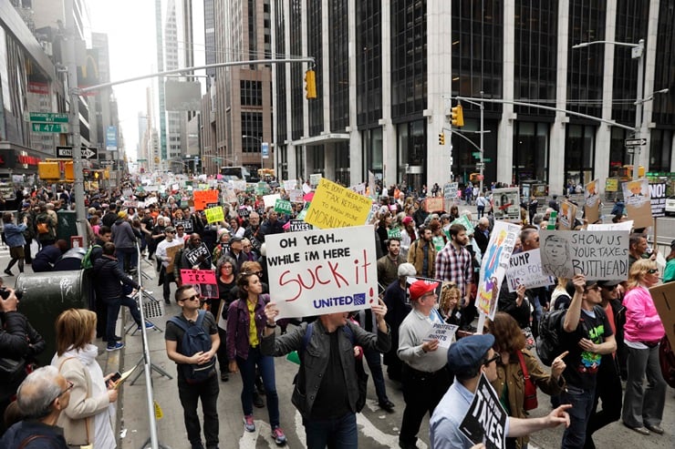People march demanding President Donald Trump release his tax returns, in New York