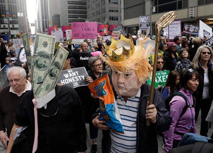People march demanding President Donald Trump release his tax returns, in New York