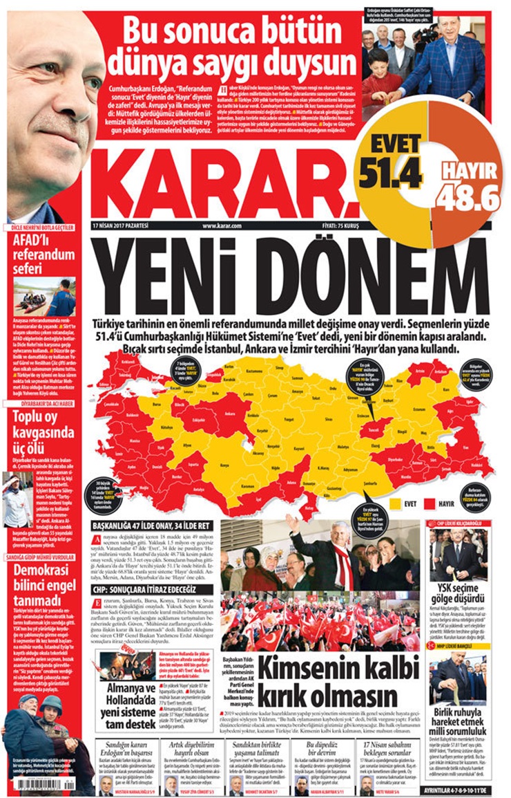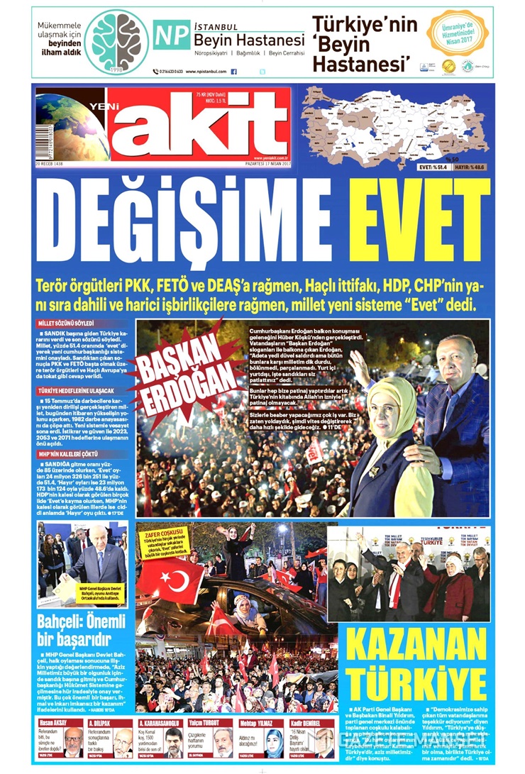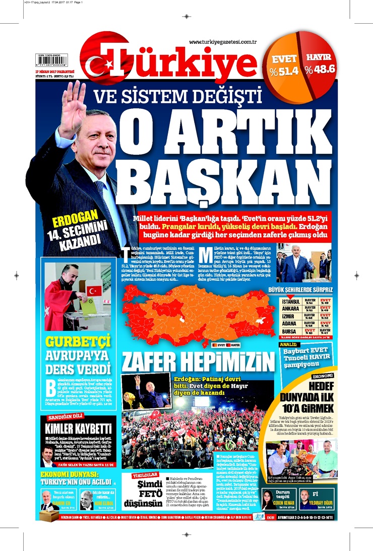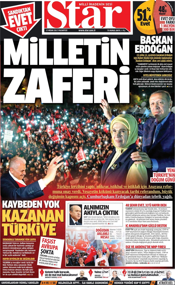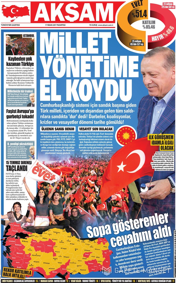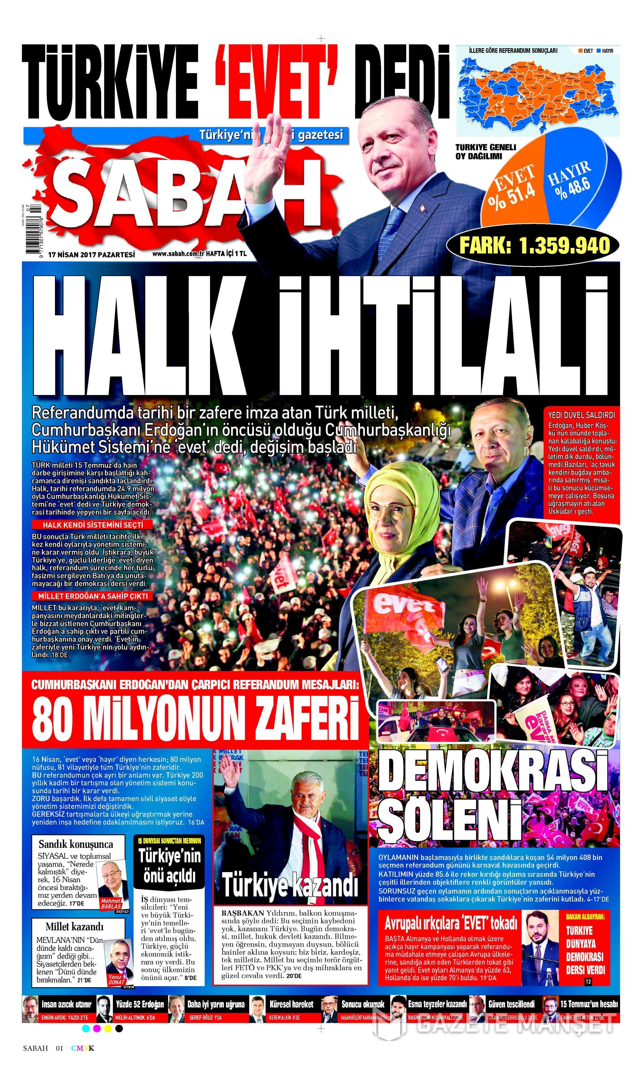 Hükümete yakınn Sabah gazetesi, ilk sayfasında Erdoğan’ın iki büyük fotoğrafını kullanmayı tercih ederek sürmanşetinde “Türkiye ‘Evet’ dedi” diye yazdı.