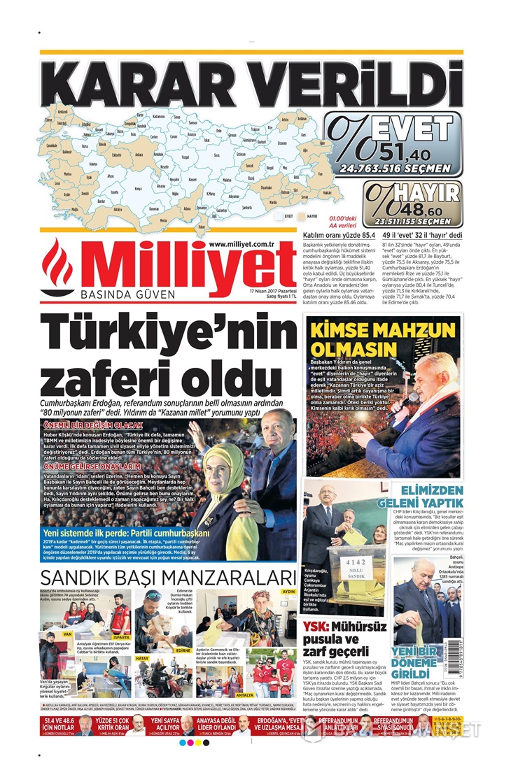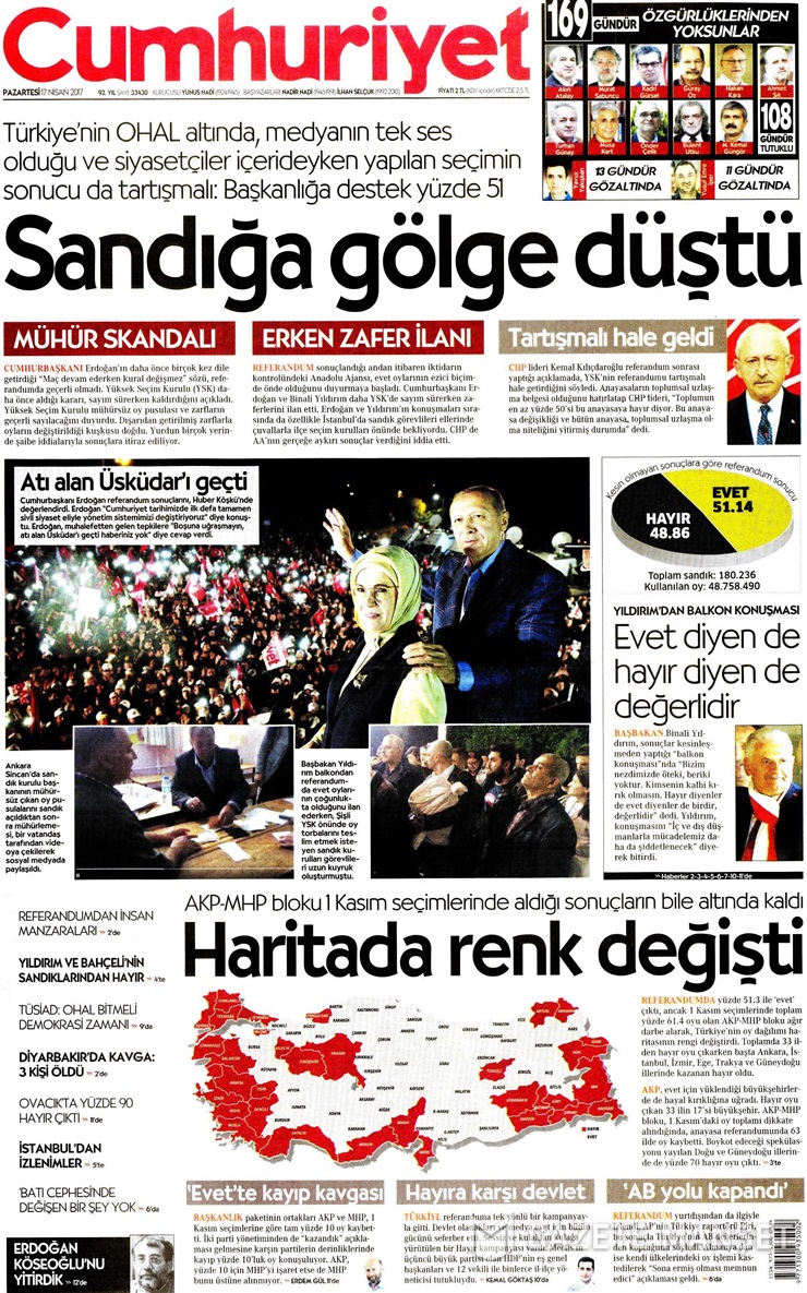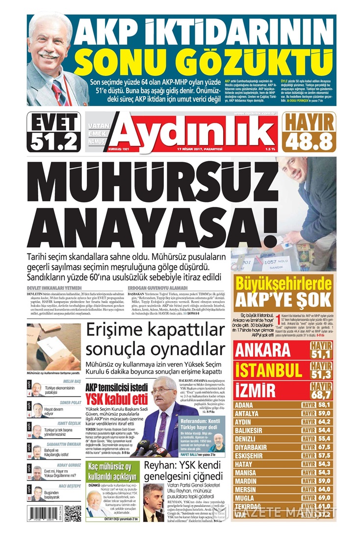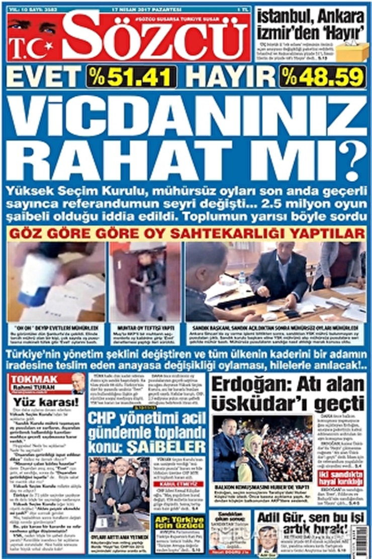 “Yüksek Seçim Kurulu, mühürsüz oyları son anda geçerli sayınca referandumun seyri değişti… 2,5 milyon oyun şaibeli olduğu iddia edildi, toplumun yarısı böyle sordu” diyen gazete, ‘göz göre göre oy sahtekarlığı yapıldığı’ iddiasını fotoğraflarla destekledi.