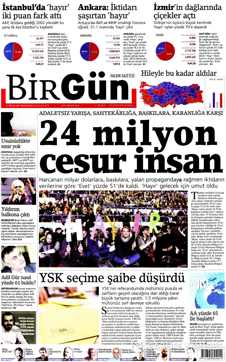 Sürmanşetinde İstanbul, Ankara ve İzmir’de ‘Hayır’ oyu çıktığına değinen BirGün, ‘adaletsiz yarışa, sahtekarlığa, baskılara ve karanlığa karşı 24 milyon cesur insan’ın olduğunu manşetine taşıdı.