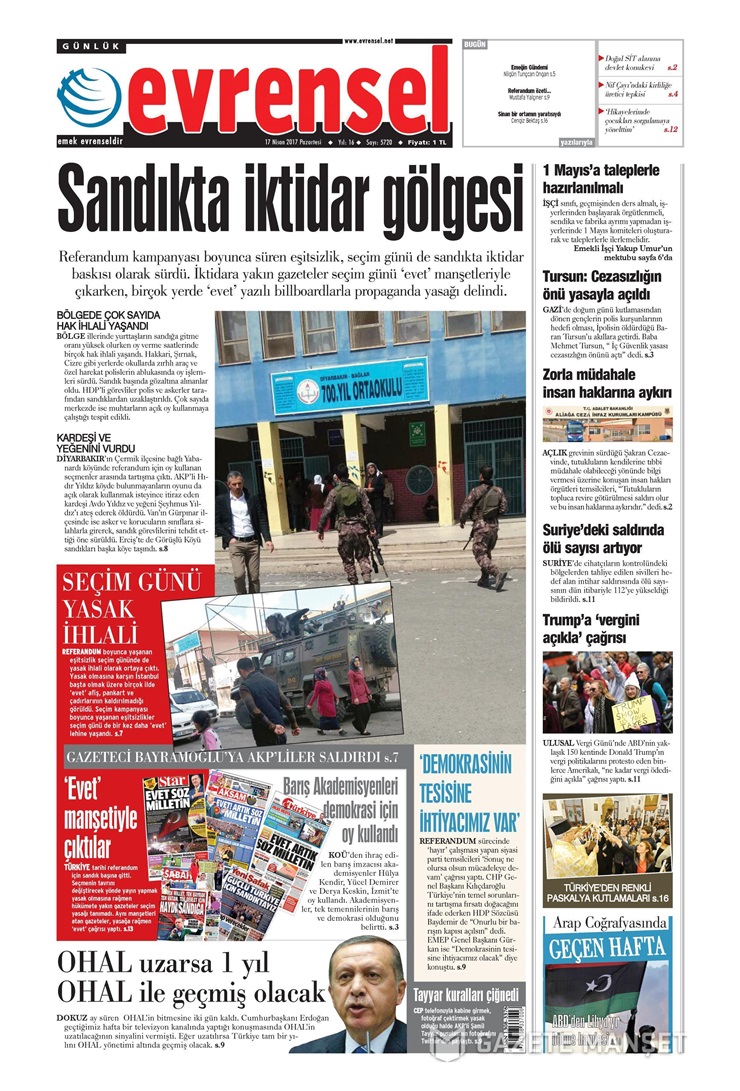 Evrensel, referandum süreci boyunca süren eşitsizliğin, seçim günü sandıkra iktidar baskısı olarak sürdüğüne dikkati çekerek, propaganda yasağının delindiğini yazdı.