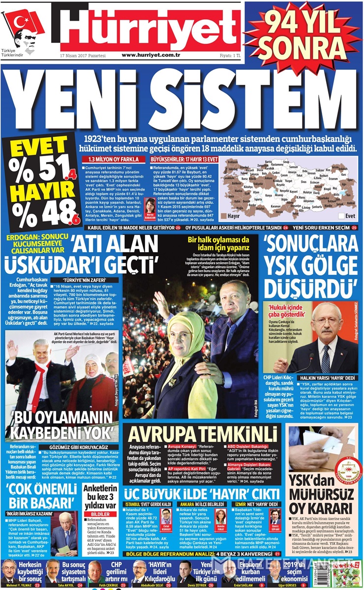 AKP ve MHP’nin toplam oylarının yüzde 61’i bulduğu ancak referandumda 10 puanlık bir kayıp olduğuna dikkati çeken Hürriyet, büyükşehirlerden 17’sinin ‘Hayır’, 13’ünün ‘Evet’ dediğini yazdı.