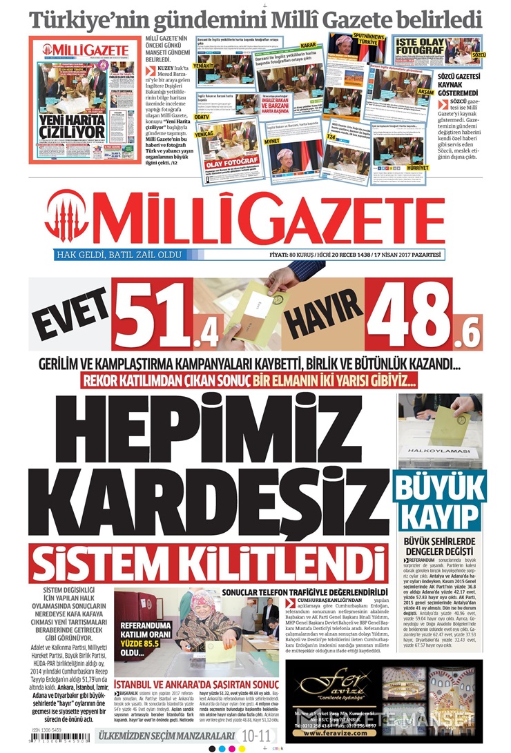 ‘Milletin kararının iç ve dış düşmanlara tokat gibi indiği’nden bahseden gazete, şöyle yazdı: “Hainlerin ve Pensilvanya’daki elebaşlarının son umudu sandıktı! Algı operasyonları ile milli iradeye yine yön vermeye kaltılar. Ama son ‘gülen’ yine millet oldu. Çoğu FETÖ’cü tutuklulardan oluşan 21 cezaevinden ‘Hayır’ oyu çıktı.”