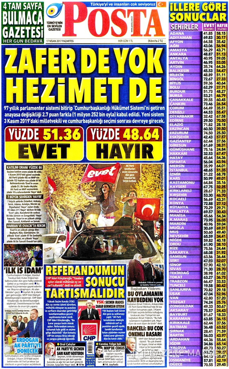‘Zafer de yok hezimet de’ manşetiyle çıkan Posta, ‘Evet’in ‘Hayır’ oylarından 1 milyon 252 bin fazla olduğuna dikkati çekti.